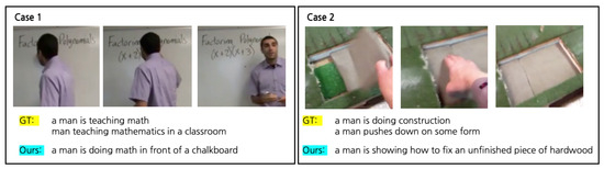 Lastly, we carried out a qualitative analysis of the MSR-VTT test. First, we analyzed the video captioning capabilities of our model. Figure 4 presents two cases, each of which contains two ground truth (GT) captions and the caption generated by our model (Ours). In the first case, our model was able to generate a sentence with a complete description of the video. More surprisingly, for the second case our model generated a long and grammatically correct caption. Compared with the ground truth captions, our model shows a more fine-grained description (e.g., unfinished, hardwood).