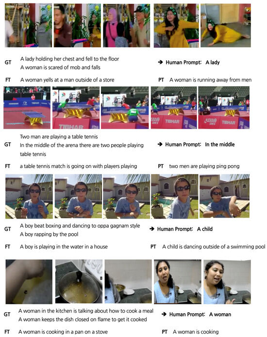 Examples of human-interactive video captioning. We only added two ground-truth (GT) captions for visualization. FT refers to the caption generated by the fine-tuned model, while PT refers to the caption generated by the human-interactive video captioning model.