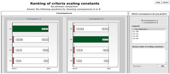The FITradeoff method allows the elicitation of scaling constants to occur more fluidly, as it enables the DM to work with comparisons of consequences by strict preference statements, while in the traditional trade-off method, indifference relationships between consequences are required, and this is one of the advantages of the method [50]. Nonetheless, the proposed method was not able to deal with the problematic ranking, making its choice as the best alternative instead of a ranking.