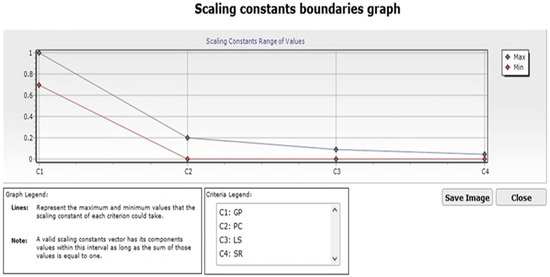The alternative with the highest global value is considered the best one for the problem. The main concern of the unique criterion of synthesis is related to the achievement of the scaling constants for the model, which represents the trade-off between the performance of an alternative in a criterion to make the compensation needed to keep the same global score as another preferred alternative.