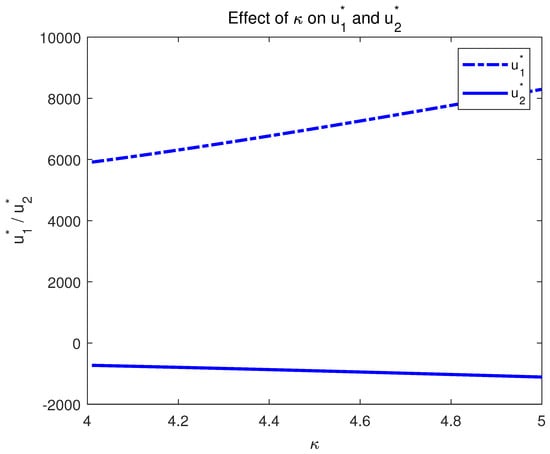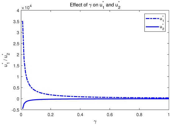 In the following part of the study, we aim to shed light on how different model parameters affect both investment strategies and equilibrium reinsurance decisions. We will do this by presenting various numerical examples. In addition, we depict the effects of these parameters on the frontier of efficiency. It is important to note that, unless stated otherwise in this section, we will be using the market parameters outlined in Table 1, following the conventions established by [26,27] and related references.