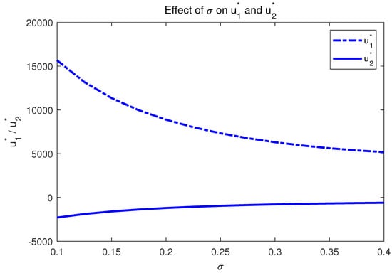 Figure 3 depicts the influence of on the insurer’s equilibrium investment strategy. When the risk increases, decreases, which is consistent with the classical asset allocation theory. Conversely, is opposite of . As the risk increases, since derivatives play a hedging role in trading, the insurer needs to manage risk, leading to increased investment in derivatives. The insurer holds opposing positions in derivatives and stocks. When the insurer becomes increasingly risk averse, signified by a higher value of , which represents the coefficient of absolute risk aversion, their investment approach consequently becomes less aggressive. As a result, we have noticed that the insurer has fewer short positions in derivatives and they have fewer long positions in stocks.