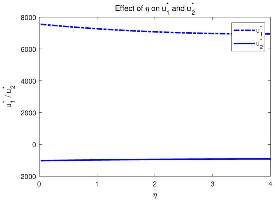 Figure 2 demonstrates the sensitivity of to changes in and . As parameter increases, it is clear that the value of also rises correspondingly. Conversely, when there is a decrease in , the value of declines. This indicates a direct relationship between and , such that higher values of result in higher values of . Similarly, there is an inverse relationship between and , meaning that lower values of lead to lower values of . This behavior can be attributed to the fact that as rises, the expected claim size increases, thereby prompting the insurer to buy less insurance and take on a greater proportion of the risks. On the other hand, an increase in introduces greater uncertainty among the insurer, prompting the insurer to seek increased reinsurance coverage to mitigate the associated risks.