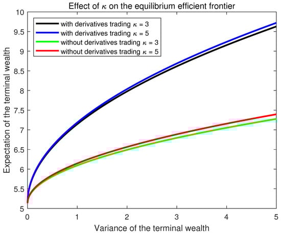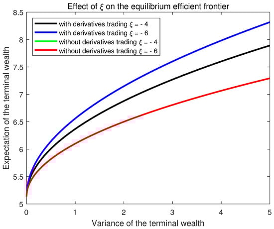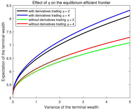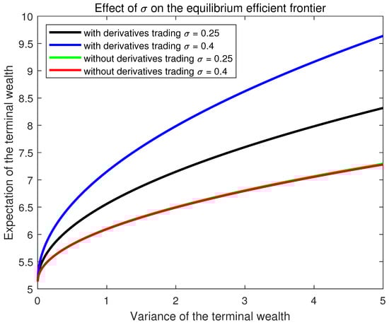 In the following part of our study, we demonstrate the model parameters’ effect on the equilibrium efficient frontier. We consider both scenarios: one involving derivative trading and another where derivatives are unavailable.