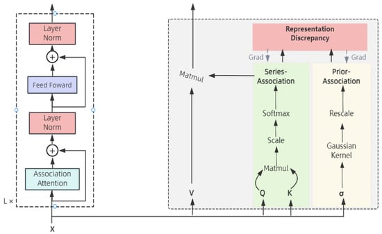 Taking into account the limitations and deficiencies of the Transformer model in handling anomaly detection tasks, this study draws inspiration from the more targeted anomaly Transformer model. It has been demonstrated to be effective on various types of time series datasets, optimizing the relevant techniques of association differences to better meet the demands of the task at hand (Figure 2).