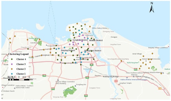 Using the hierarchical clustering method, all 95 monitoring stations were clustered, resulting in four different clusters. Combined with POI data, the visualization of the clusters is shown in Figure 3. Research reveals that stations in Cluster 1 and Cluster 3 are located in the city center with dense building facilities, including prominent urban structures such as commercial buildings, cultural institutions, and shopping centers. Stations in Cluster 2 are situated in peripheral areas, surrounded mainly by schools and parks. Stations in Cluster 4 are located in comprehensive areas, surrounded by various activity facilities. After clustering, four clusters of air quality monitoring datasets were obtained at the station level. Considering data quality and the direction of subsequent research, stations in Cluster 1 were selected as the experimental baseline data.