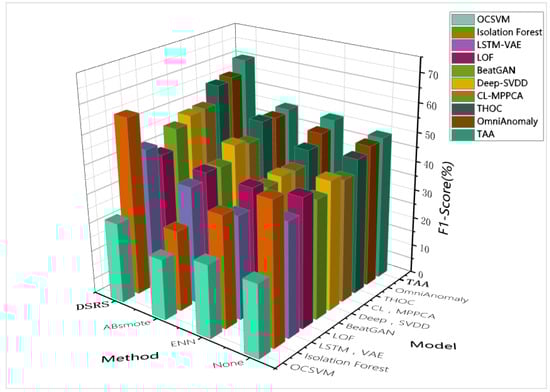 In this study, we evaluate several representative baseline models, including OmniAnomaly [40], Deep-SVDD [41], and THOC [42], based on the DSRS-AAT model. Additionally, we compare two different sampling methods: undersampling, represented by ENN, and oversampling, represented by ABSMOTE [43]. All of the baseline models above take default parameters and can be implemented in the sklearn library or in the GitHub link given in the citation study. Through these comparative experiments, our aim was to demonstrate the superiority of the proposed method in anomaly detection tasks.