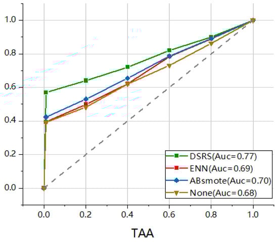 The Receiver Operating Characteristic Curve (ROC curve) is a graphical tool that illustrates the performance of a classifier, showing the relationship between the True Positive Rate (TPR) and the False Positive Rate (FPR) of the classifier at different thresholds. The Area Under the Curve (AUC) value represents the area under the ROC curve, which is used to measure the performance of the classifier. A higher AUC value, closer to 1, indicates better classifier performance, while a lower AUC value, closer to 0, indicates poorer classifier performance. The gray dashed line in the graph represents an AUC value of 0.5, indicating a random classifier. It can be observed that under the DSRS method proposed in this study, the classifier’s performance has significantly improved (Figure 5).
