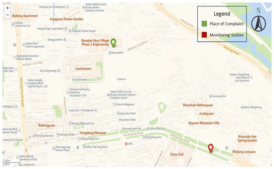Therefore, this study selects stations with latitude and longitude deviations between 0.008983 and 0.011406 for the analysis of anomalies. Here, the analysis is conducted on the data of station CEG41930016 on 29 December. This station is located at the intersection of Wenming East Road and Meiyuan Road, under the street lamp at Banqiao Seafood Plaza Wenming East Branch, with coordinates (110.371013, 20.037951). Specific geographic information is shown in the Figure 7.