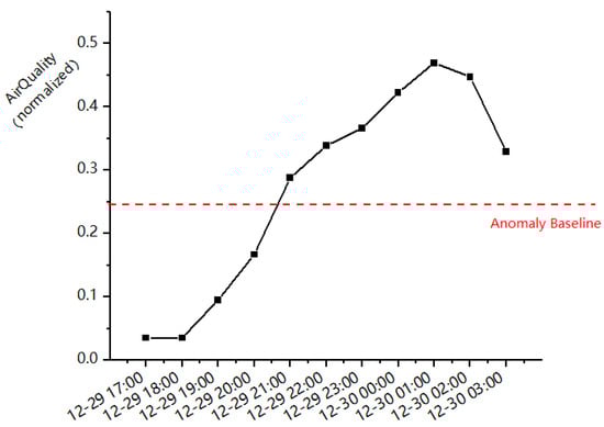To trace the anomalies and demonstrate the association, the Figure 8 shows a segment of air quality time series data after 17:00 on that day.