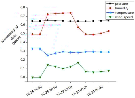 From the Figure 8, it is evident that the air quality data sharply rose after 18:00 on that day, surpassing the anomaly baseline after 20:00, which was detected as an anomaly. However, the meteorological data shown in Figure 9 indicate that during this period, variables such as air pressure, wind speed, and temperature did not exhibit significant fluctuations. Therefore, it can be ruled out that the air quality anomaly was caused by meteorological changes.
