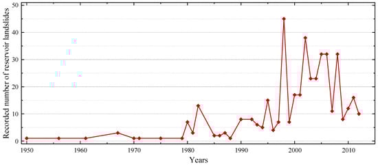 The effects of groundwater seepage significantly influence the stability of most slopes, especially for those located in the reservoir area. In Japan [], nearly 60 percent of the reservoir landslides occurred during the sudden drawdown of the reservoir water level, and the remaining 40 percent occurred during the rise period of the reservoir water level, including the initial reservoir impoundment. In China, the Three Gorges Conservancy project resulted in a large increase in the reservoir water level since 1994, and correspondingly, the number of landslide hazards increased in the first ten years, as shown in Figure 1. Accurately locating the potential reservoir slope failure and taking effective protective measures is always the main work to ensure the safety of reservoir area. The rainfall and fluctuating external water levels are usually seen as the main reasons for inside seepage changes and are therefore considered as main factors responsible for landslides and reservoir slope failure. For this issue, an effective method for analysing the influence of dynamic and fluctuating water levels on reservoir slope stability is presented in this work.