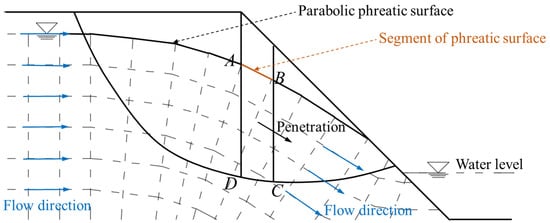 To study the influence of varying reservoir water levels on the reservoir slope stability, it is necessary to obtain the relationship between the external water level and the seepage field inside of reservoir slopes, accounting for the seepage and seepage forces on slope stability. The determination of the phreatic surface is a crucial issue in the field of seepage, involving unconfined free surface seepage. Based on numerous slope examples from projects, scholars have made great progress in numerical analysis using the finite element method [,]. Using numerical analysis, Zhang et al. [] studied the influence of the phreatic surface positions and matric suction on the seepage field. By coupling the seepage field and stress field, Zhang and Dai [] found that the soil permeability and seepage boundary conditions would directly affect the slope stability. Mao et al. [] investigated the change in seepage field and the distribution of unsaturated zones inside the reservoir slope, and then carried out the stability analysis considering saturated–unsaturated seepage based on the theory of unsaturated soil mechanics. Using the commercial software SEEP/W and SLOPE/W, Mandal, Li and Shrestha [] used the Morgenstern–Price method to investigate the influence of the rising rate of the reservoir water level on the rock slope stability. Most numerical simulations are based on complex numerical models and simulation schemes. To be more applicable to a wide range of practical situations, some scholars simplified the calculation formula for the phreatic surface to yield a simplified seepage field which could be used to calculate the pore water pressure or conduct equivalent seepage analysis for stability analysis. Zheng et al. [] obtained the simplified formula for calculating the phreatic surface under falling reservoir water levels based on the Boussinesq equations and further studied the difference between the analytical solutions and numerical solutions of the phreatic surface by finite element software PLAXIS []. Similarly, Sun et al. [] used the polynomial expression to fit the phreatic surface equation to obtain a simpler method for practical applications, by which the influence of rainfall and reservoir water level fluctuation on reservoir slope stability is further investigated. Moreover, Deng et al. [] simplified the actual flow direction in seepage into the horizontal direction and classified the slices of slope according to the phreatic surface position. The stability of the reservoir slope with different classifications is analysed using the simplified Janbu method. Lu and Chen [] obtained the analytical solution of pore water pressure on the failure surface by assuming that the phreatic surfaces were parabolic; by using the simplified Bishop method, the circular critical failure surface (CFS) and the corresponding factor of safety (FS) were determined for the slopes under two-dimensional steady seepage.