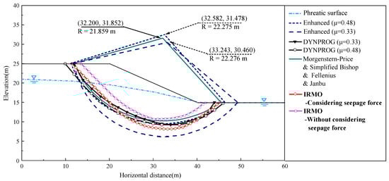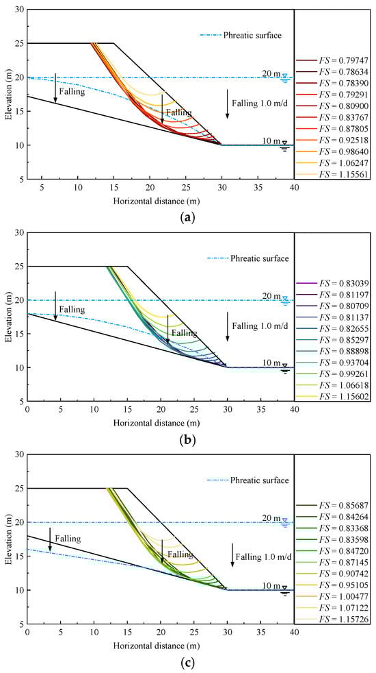 It could be found that the hysteresis of the phreatic surface significantly varies with different permeability coefficients. When the water level in the reservoir falls, the smaller the permeability coefficient is, the steeper the phreatic surface drops, and the greater the hydraulic gradient, the more pronounced was the hysteresis exhibited by the phreatic surface (higher phreatic surface positions compared to the same external water level). In consideration of the difference in permeability characteristics between upper silt and limestone bedrock, the phreatic surfaces are offset at the interaction between soil layers, especially for those cases with higher permeability coefficients (Figure 20c). In such cases, the critical failure surfaces searched by the IRMO algorithm are shown in Figure 21, and the corresponding minimum FS values are shown in Figure 22.