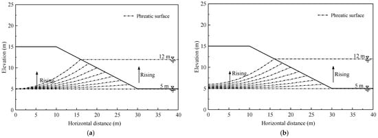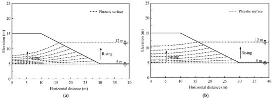 Phreatic surfaces corresponding to the reservoir water level dropping at 0.1 m/d: (a) clay slope; and (b) silt slope.