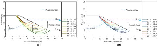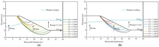 Non-circular critical failure surfaces corresponding to the reservoir water level dropping at 0.1 m/d: (a) clay slope; and (b) silt slope.