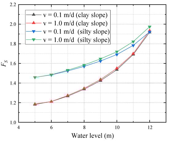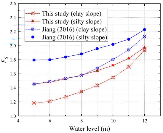 As shown in Figure 13, the minimum FS increases with the rising reservoir water level, and the increasing rate increases with a higher rising rate as well. For different soil slopes, the influence of the rising rate on the silt slope is greater than that of the clay slope. Comparing the calculated results with the previous study by Jiang [], as shown in Figure 13, it could be found that the calculated FS values of this study are smaller than Jiang []. This is because the matric suction effect was not considered in this study. But it also proves that the matric suction is beneficial for slope stability during the rising of reservoir water level, especially in low water levels [].