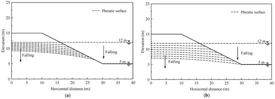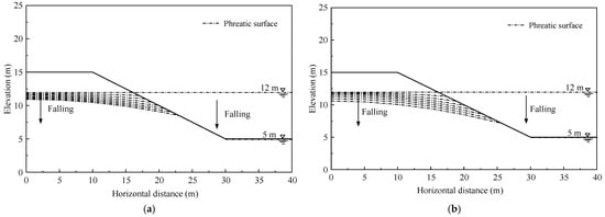 Phreatic surfaces corresponding to the reservoir water level dropping at 1.0 m/d: (a) clay slope; and (b) silt slope.