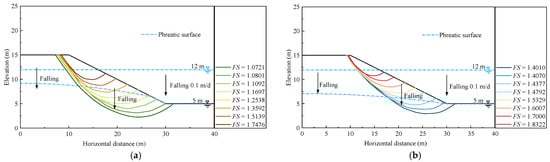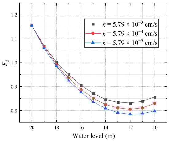 It could be found that there are no significant differences between the CFSs in the condition of the different permeability coefficients (Figure 21), while the minimum FS of this layered slope decreases by 32.11%, 30.31%, and 28.01%, respectively, as shown in Figure 22. It illustrates that the smaller the permeability coefficient of the slope soils is, the more adverse effect it has on the stability of the slope. When the reservoir water level drops, the groundwater inside the slope seeps outwards, generating dynamic water pressure pointing outwards the slope, which is detrimental to the slope stability. The smaller the permeability coefficient, the more pronounced the hysteresis of the phreatic surfaces inside the slope, the greater the dynamic water pressure, and the longer it exists. Therefore, the smaller permeability coefficient results in a smaller minimum FS for the slope. Additionally, it can be observed that there is a slight increase in minimum FS at the lower water level, which results in the most adverse situation of the slope when the reservoir water level is at 12 m instead of the lowest level. It could be explained that, after the reservoir water level drops over 12 m, the remaining groundwater inside the slope still gradually seeps outward as the lag effects. As the phreatic surfaces gradually flatten out during the descent, the hydraulic gradient decreases, leading to a decrease in the dynamic water pressure. Moreover, the pore water pressure constantly decreases as the groundwater seeps out, the matrix suction gradually increases, and the shear strength of the soil increases. Ultimately, before the reservoir water level drops to its lowest position, the minimum FS slightly rebounds. Therefore, it is necessary to control the dropping rate of the reservoir water level to reduce the slope instability before the lowest water level during reservoir drawdown.