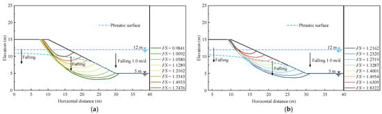 Non-circular critical failure surfaces corresponding to the reservoir water level dropping at 1.0 m/d: (a) clay slope; and (b) silt slope.