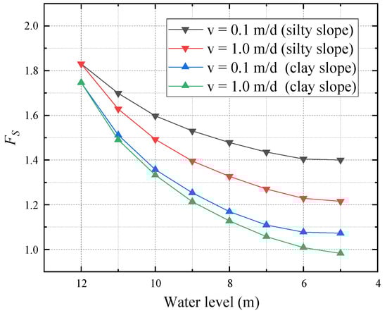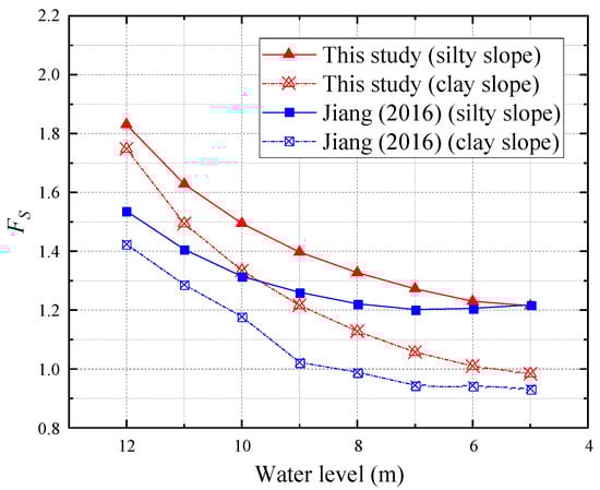 As shown in Figure 18, the minimum FS of silt slope decreases by 23.53% and 33.62% when the water level drops at 0.1 m/d and 1.0 m/d, respectively. Under the same conditions, the decrement in minimum FS for clay slope is 38.65% and 43.69%, respectively. It could be found that the stability of clay slope would decrease more than that of the silt slope under the same dropping rate of the reservoir water. Furthermore, the decreasing differences in the minimum FS of each slope are 10.09% and 5.04%, respectively, which demonstrates that the stability of the silt slope is more easily influenced by the different dropping rates. Comparing the results of the water level dropping at 1.0 m/d with the previous study, as shown in Figure 19, it could be found that the calculated FS values of this study are higher than those found in Jiang [], which is opposite to those for rising reservoir water levels. This is due to the fact that matric suction is not considered in this study. When the reservoir water level drops, the negative impacts of the matric suction on slope stability should be adequately considered in slope stability analysis. Unlike the cases for rising water levels, the minimum FS will slightly increase when the reservoir water level is close to the lowest level. Because of the hysteresis effect of the phreatic surface, the inside groundwater will flow to the outside slope for a short while after the reservoir water level drops to the lowest level. In such a situation, the contributions of increasing matric suction and decreasing pore water pressure are beneficial to the slope stability compared to the decreasing hydrostatic pressure of reservoir water. But, with the increasing dropping rate, the difference between these decreases due to the short drainage time and maintenance of pore water pressure.