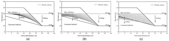 Phreatic surfaces corresponding to the different permeability coefficients with reservoir water level falling at 1.0 m/d: (a) k = 5.79 × 10−5 cm/s; (b) k = 5.79 × 10−4 cm/s; (c) k = 5.79 × 10−3 cm/s.