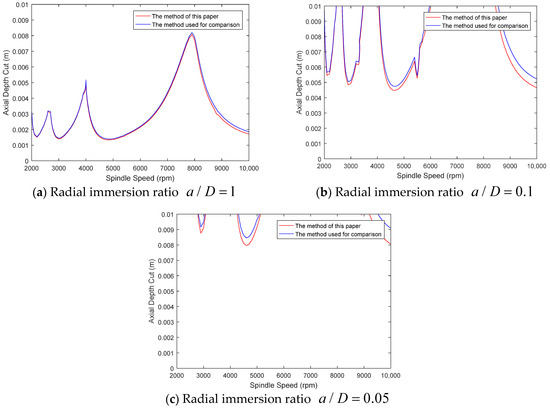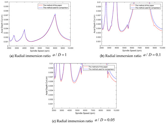 The parameters selected for the double-degree-of-freedom model are the same as those used in the single-degree-of-freedom milling model. Figure 2 lists the stability diagrams for both methods under radial immersion ratios of 1, 0.1, and 0.05. As can be seen from Figure 2, under different radial immersion ratios, the change trend of axial depth cut with the increase in spindle speed is basically the same as that of the reference method, indicating that the calculation results of the two methods are basically the same regardless of the size of the radial immersion ratio. It shows again that the method proposed in this paper is basically consistent with the results of the reference method, which proves that the method proposed in this paper ensures the accuracy of the calculation.