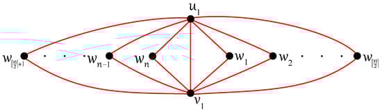 For , the optimal drawing D of shown in Figure 2 offers a disconnected subgraph, , with the isolated vertex and so the next result is obvious.
