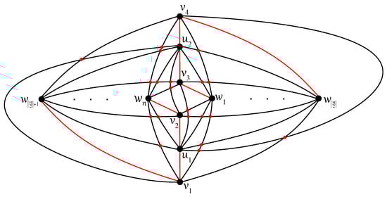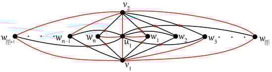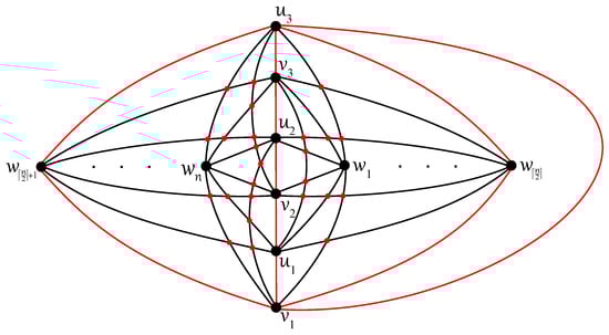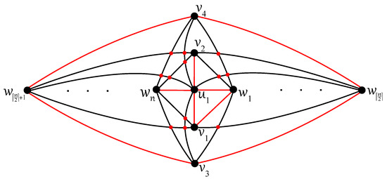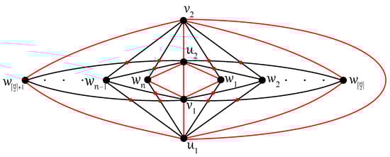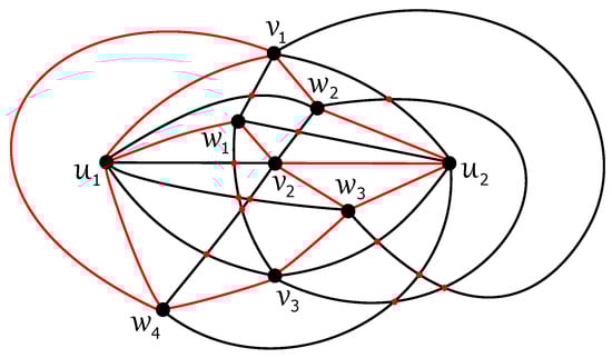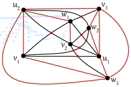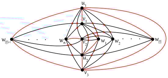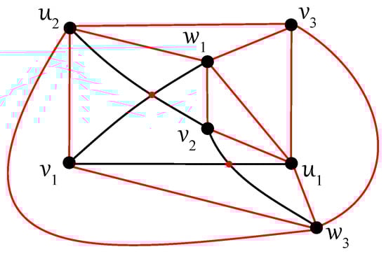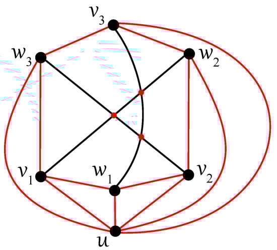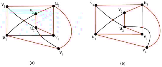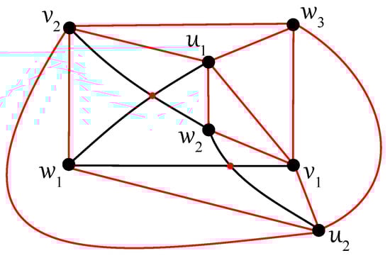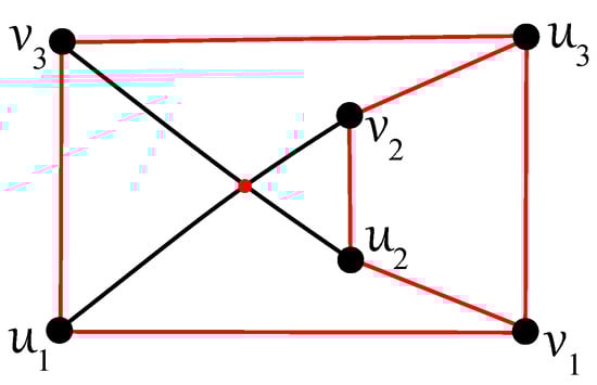 Any edge can be crossed once at most in D, otherwise two crossings on the edge result in no crossing on six edges ; a connectedness of within the subgraph is obtained thanks to at least one uncrossed edge for some . Without loss of generality, let u be adjacent in with both vertices, , , and let each edge, and , be crossed just once in D. In the rest of the proof (using ), also let the edge be uncrossed in D. Then, at least one of the vertices, , and , , say and , must be included in other connected components of as the vertices u, , and . Both edges and are crossed in D according to their incorporation into different connected components. Thus, the edge must be contained in without any crossing provided by . Next, each of the edges and cannot be crossed in D because the edge offers one crossing and . Therefore, the second connected component of must be isomorphic to the complete bipartite graph , with the vertex set consisting of , , and . The edges and must be crossed only once in D, and therefore both vertices and offer two crossings on an incident edge with or . The obtained contradiction with completes the proof of Theorem 4. □