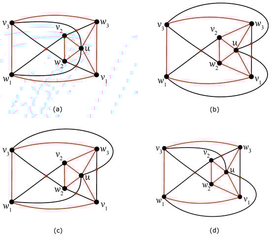 Let be a subdrawing of induced by D without the considered vertex and thus with a decrease of three crossings. For , let us first consider the drawing of , as given in Figure 4a. It is not difficult to verify that at most two edges of can be crossed by inserting the vertex with into arbitrary region, such that the subgraph preserves its connectedness, that is, must be connected. The same reason gives a connectedness of for three other possible drawings of , as shown in Figure 4. For presented in Figure 4b, three edges of can only be crossed by inserting into the region incident with both vertices u and , but a connectedness remains intact. It is important to deal with both drawings in Figure 4c,d (despite their isomorphism), because their isomorphism is not preserved with respect to the considered labeling of vertices and for a subsequent insertion of a new vertex from the third partition. Finally, suppose of given in Figure 5. The vertex can only be placed in a region of with the vertex u of on its boundary, and exactly three of the six edges incident with u become crossed. We receive a connectedness of in all considered cases. In the following, let us suppose that none of the values in can be greater than two.