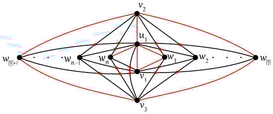 The exact value for the crossing numbers of the complete tripartite graphs were established by Ho [14]. For , the optimal drawing D of shown in Figure 19 offers a disconnected subgraph , with the connected component on the five vertices , , , , , and so the next result is also obvious.