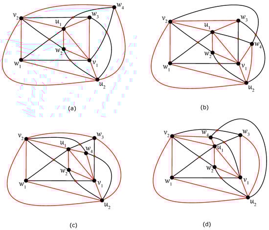 Four optimal drawings of with : (a) the subgraph on nine edges and with the cut vertex u; (b) the subgraph on ten edges; (c) the subgraph on nine edges, with no cut vertex and two vertices, , , of degree three; (d) the subgraph on nine edges, with no cut vertex and two vertices, , , of degree three.