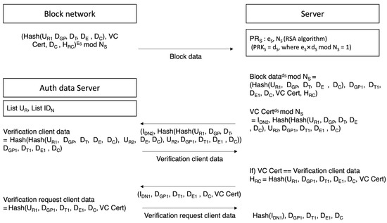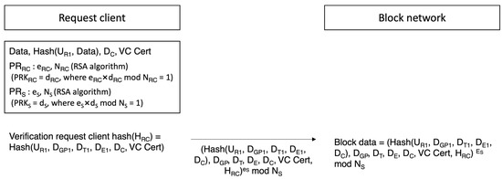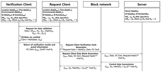 In the block data, effective data consist of the hash of authentication identification data, location data, time data, environmental data, and control data. VC Cert, which is the verification data of the verification client, and HRC, which verifies the data of the request client, do not have any meaning on their own. Formula (7) shows the results of data verification performed by the verification client, whereas Formula (8) is the comparative hash structure for verifying the verification client in the processing server. Formula (9) shows the structure of the results of the hash computation performed by the request client on the data and its authentication data, including the verification results of the verification client.