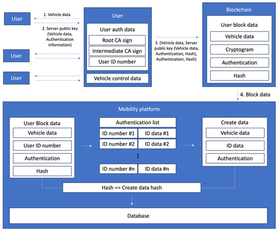 Furthermore, the extensibility and flexibility of security systems not keeping up with the rapid increase in intelligent vehicles is posing challenges to vehicle management. Blockchains can be utilized as a solution to such challenges in V2X environments. Blockchains generate blocks in real time and store data in a distributed manner, with encrypted data that is not identifiable by a third party [46]. Confidentiality of PII (personally identifiable information) means that personally identifiable information must only be accessible to authorized users [47]. In the proposed mechanism, the PII consists of user authentication data and authentication identification numbers. The user authentication data are only stored in a client and a server and used for identifying a user in the data transfer process. Effectively speaking, only authentication identification numbers mapped to the user authentication data are used in the communication process. Therefore, the confidentiality of PII can be guaranteed, as authentication needs to be performed with a hash containing user authentication data to prove the communication even if the authentication identification number is leaked.