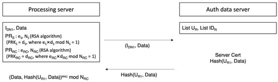 To verify the data received from the request client, the auth data server generates a hash with the verification client data and the newly received request client verification data, as shown in (Formula (13)), and transfers them to the processing server.