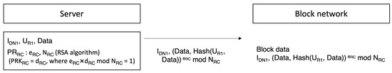 Firstly, the block data generation module, when generating a data block transferred from a client to a server, records the verification client data generated by the transferred-data verification module in the block network. Block data are generated as shown in Figure 5. The request client encrypts the data to be recorded in the block with the public key of the server and generates a block into which the data are inserted.