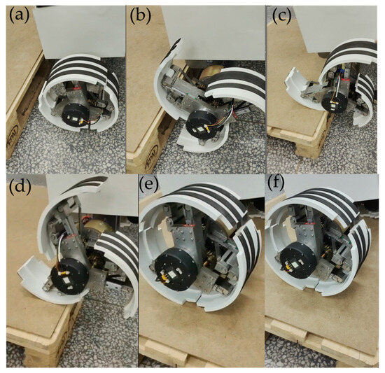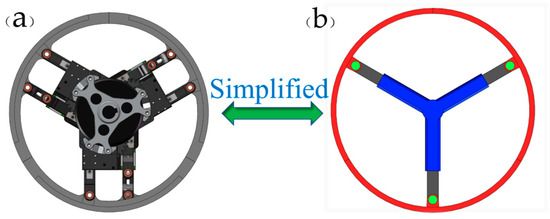 Mobile robots with deformable wheels offer the benefits of wheeled mobility on flat terrain and the flexibility to traverse steps through deformation, simplifying robotic control. Research on deformable wheels is divided into two stages: passive and active. In the passive stage, robots operate with circular wheels on flat terrain, and wheel deformation occurs because of friction when encountering steps. Notable contributions include Sijun Ryu et al.’s design, where deformation is triggered by centrifugal force and friction, but this approach limits the robot’s speed and efficiency because of its mechanical structure [13]. In their approach, wheel deformation is initiated by centrifugal force and friction. However, the distinctive mechanical structure introduces a drawback: the circular state of the wheels cannot sustain high speeds, significantly restraining the efficiency advantage of wheeled mobile robots. Moreover, the success rate of the deformation remains uncertain. Kim et al. developed a mobile robot with passive deformable wheels that can surmount obstacles up to 2.6 times the wheel’s radius [14]. They introduced a novel deformation-triggering mechanism and fine-tuned the wheel parameters, increasing the deformation success rate and enabling the robot to cross obstacles up to 3.25 times the wheel’s radius [15]. However, the deformation of passive wheels depends on external conditions, leading to uncertainty and potential setbacks in obstacle crossing, which can ultimately affect the robot’s operational efficiency. Furthermore, Zheng Chuanqi et al. developed the WheeLeR robot with an innovative passive deformable wheel that changes shape through friction between the wheel rim and the surface, as well as torque from the central gear [16]. Although the robot can ascend obstacles up to 2.4 times the wheel’s radius in its wheel–leg configuration, the success rate of these morphological changes is constrained by friction, introducing uncertainty.