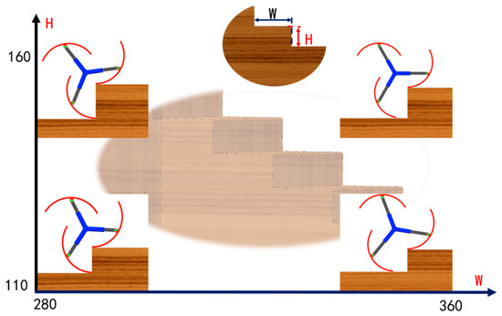 Figure 3 illustrates the relationship between overcoming steps of various sizes and the deformation wheel’s coordinates, with the horizontal and vertical coordinates corresponding to the tread’s width and height of the step. The intervals for the horizontal and vertical coordinates reveal that the deformation wheel can navigate step tread widths in the range [280 mm, 360 mm] and step heights in the range [110 mm, 160 mm]. From Figure 3, it can be inferred that for steps of the same width, the higher the step, the greater the change in the angle of rotation of the rim (theta). Conversely, for steps of the same height, the wider the step, the greater the increase in the radius of the deformed wheel. Therefore, to reduce the amount of change in the center of mass of the wheel, it is a very effective measure to reduce the distance between the edge of the wheel’s rim and the step’s riser.