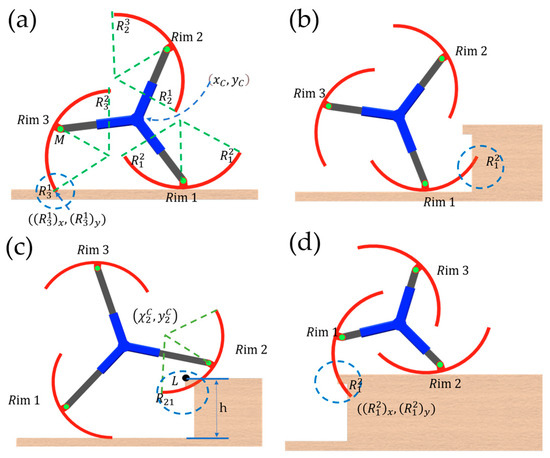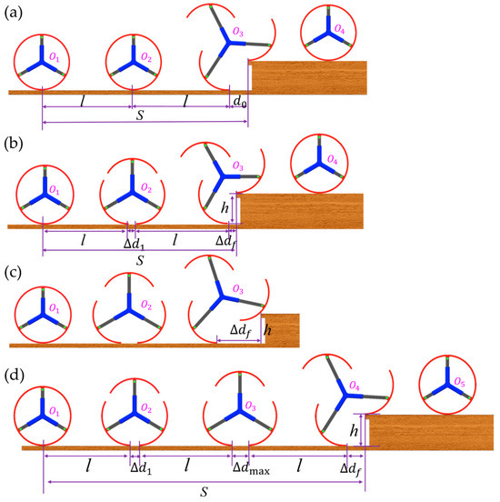 where is the number of maximum adjustment distances and is the initial distance between the deformed wheel and the step. If then corresponds to Figure 4b, where . Here, denotes the adjusted value corresponding to the maximal radius of the deformed wheel. If then the adjustment method depicted in Figure 4b cannot address the issue, and needs to be adjusted according to Figure 4d.