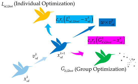 As shown in Figure 7, and represent the historical ideal locations of individuals and groups, respectively, and and represent the components that are experienced by the self and the society, respectively. The random numbers in the interval are represented by the variables and , respectively, and the individual and social acceleration factors, and , respectively. The particle is guided to iterate toward the ideal solution by the acceleration factor; a value of in excess of may result in the particle roving throughout the field of the search, and vice versa, in an early state of convergence, and represents the factor of the inertia. The particle’s capacity to execute global optimization searches is strengthened by a higher value, whilst its ability to undertake local optimization searches is enhanced by a lower one.