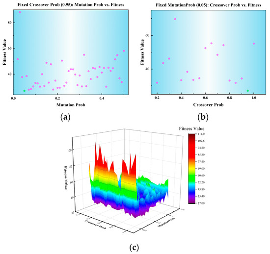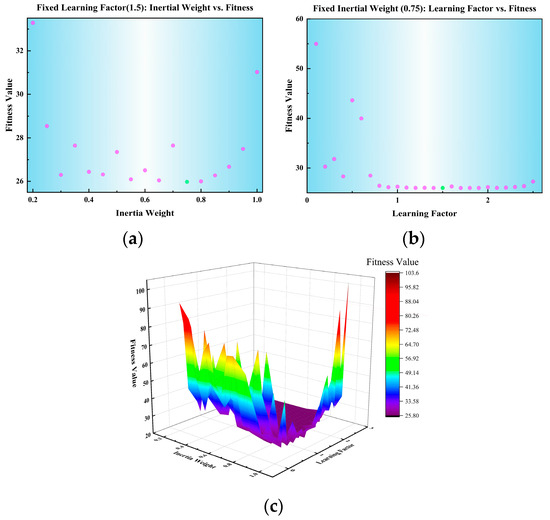 Sensitivity analysis of PSO parameters. (a) Sensitivity analysis of inertia weights, purple dots indicate the fitness values of different inertia weights for the same learning factor, green dots indicate the inertia weight points corresponding to the minimum fitness value; (b) sensitivity analysis of learning factors, purple dots indicate the fitness values of different learning factors with the same inertia weights, and green dots indicate the learning factor points corresponding to the minimum fitness value; (c) sensitivity analysis for learning factors and inertia weights.