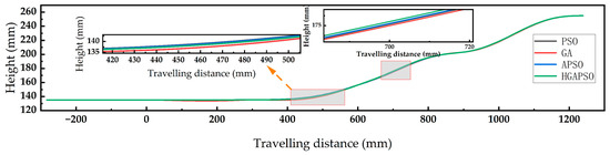 To conduct a comparative analysis between the HGAPSO algorithm and the other three algorithms for optimizing the trajectories of the deformed wheels to overcome the steps, each of the four algorithms was applied 50 times to perform the trajectory optimization. At the end of each algorithmic iteration, all the fitness values were recorded, and the average, minimum, and maximum values of the fitness associated with the algorithmic performance were examined. As can be seen in Table 3, the HGAPSO technique’s maximum value is far lower than the maximum values of the other three algorithms. The algorithm with the worst performance, the GA, has the highest maximum value. The APSO method trails the HGAPSO algorithm by just a small margin, and the HGAPSO algorithm’s mean and minimum values are, likewise, much lower than those of the other algorithms. The HGAPSO method outperforms the other three algorithms in terms of the difference between the maximum and minimum values, which indicates that the HGAPSO’s is more stable than the other algorithms. The comparison of these four aspects demonstrates the superiority of the HGAPSO algorithm.