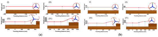The trajectory of the center of mass of a deformed wheel overcoming a step. (a) The deformation wheel executes an unoptimized trajectory to overcome the step; (b) the optimized deformation wheel’s trajectory that navigates the step at . In the figures I, II, III, and IV represent the preparation stage, adjustment stage, step overcoming stage, and recovery stage, respectively, of the deformed wheel when overcoming a step.