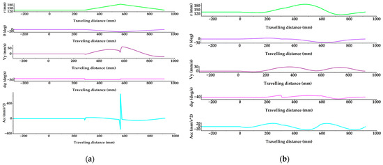 The degrees of freedom associated with the deformed wheel’s execution of the required trajectory as it overcomes the step are depicted in Figure 14a,b, which correspond to the wheel’s center-of-mass trajectories indicated in Figure 13a,b, respectively. More insights into reasons the trajectories optimized using the HGAPSO are smoother can be gained by comparing Figure 14a,b. When the deformation wheel is climbing the steps, the degrees of freedom corresponding to the HGAPSO-optimized trajectory shift more smoothly overall than in Figure 14a, avoiding the abrupt change depicted in Figure 14a. Particularly when comparing the acceleration and velocity in the y-axis direction between the two figures, it can be observed that the deformed wheel’s velocity and acceleration in Figure 14a produced a sudden change when the wheel approached , and the acceleration’s sudden change even reached approximately . In contrast, in Figure 14b, the velocity and acceleration were allowed to fluctuate slightly within a narrow range, with the acceleration in particular falling to . The comparison presented above clearly shows that using the HGAPSO-optimized trajectory greatly increases the mobile robot’s stability.