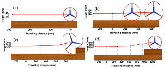 The optimized deformation wheel’s trajectory that navigates the step at . In the figures (a–d) represent the preparation stage, adjustment stage, step overcoming stage, and recovery stage, respectively, of the deformed wheel when overcoming a step.