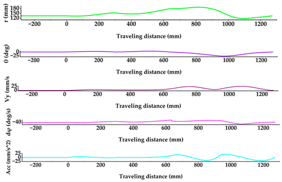 When the deformed wheel travels along the -axis direction at a constant speed, the displacement in the -axis direction is constant at time , i.e., , and from Equation (17), it can be deduced that the acceleration in the x-direction is continuous and constant function equal to zero. Furthermore, it can be deduced from Equations (18) and (19) that is continuous because the wheel’s center-of-mass path produced by the fifth-order Bézier curve guarantees that the acceleration is continuous. In conclusion, the wheel’s center-of-mass trajectory that is constructed can ensure that both the and values of the wheels are continuous at the same time.