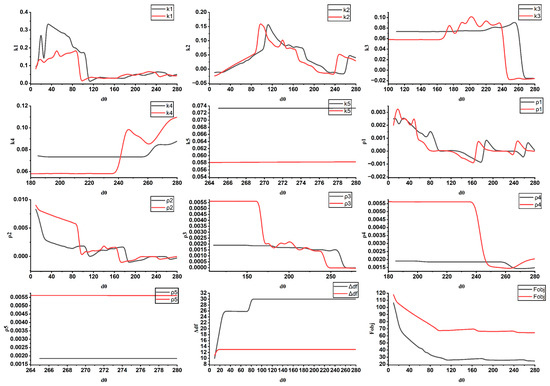 Optimization results of a mobile robot overcoming steps of different heights under different initial conditions. The black curve shows the parameters of the optimized curve for a step with height , and the red curve shows the parameters of the optimized curve for a step with height .
