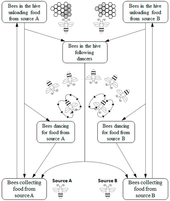 Both bees, onlookers and scouts, are also known as unemployed bees. In the beginning, all positions of food sources are found by scout bees [35]. The behavior of the bees described above is presented in Figure 1.