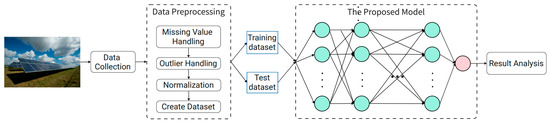 The workflow of the proposed model is shown in Figure 1 and follows a structured process. First, the power data and various influencing factors of the photovoltaic device are collected to obtain the raw data to be processed. In the process of dataset creation, missing value processing, outlier processing, and normalization operations are performed, and the data within a fixed time step are used as a multivariate input using a sliding window method. Subsequently, the created dataset is divided into a training set and a test set according to a predetermined ratio. The training data are then input into the network to be trained, and a certain number of iterations are performed to obtain the trained model; then, the test data are input to obtain the test output results, and finally, the results are analyzed.