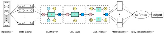 Figure 4 depicts the structure of our proposed model, which involves several interconnected layers. The input format of the model is initially determined by a defined lookback. The LSTM layer with LeakyReLU activation consists of 100 neurons, whose output are connected to a GRU layer with ReLU, which contains 100 neurons. The initial layers, comprising LSTM and GRU units, possess strong memory and long-range dependency capture capabilities, effectively addressing the limitations of traditional RNNs. The data then pass through a bidirectional LSTM layer, composed of LSTMs with 128 neurons and the ReLU activation function, enabling effective information capture from both past and future contexts, thereby enhancing sequence understanding and prediction. The subsequent layers include batch normalization to stabilize the input data distribution and accelerate model learning, dropout layers to prevent overfitting, and the integration of an attention mechanism to facilitate enhanced learning and assign weights between different data points. For attention mechanism functions, when encountering anomalous transitions between different time series features, the weights can be adaptively adjusted in real time to help extract time series data associations. In this way, when the prediction is validated, the predicted output of the anomaly relationship can be better transformed. Following these layers, another batch normalization layer and dropout layer are implemented. Finally, the data are flattened and input into a linear dense layer with softmax activation function for output. Through this comprehensive network structure, our proposed model achieves enhanced sequence prediction capabilities by combining various advanced techniques and leveraging the strengths of each layer.